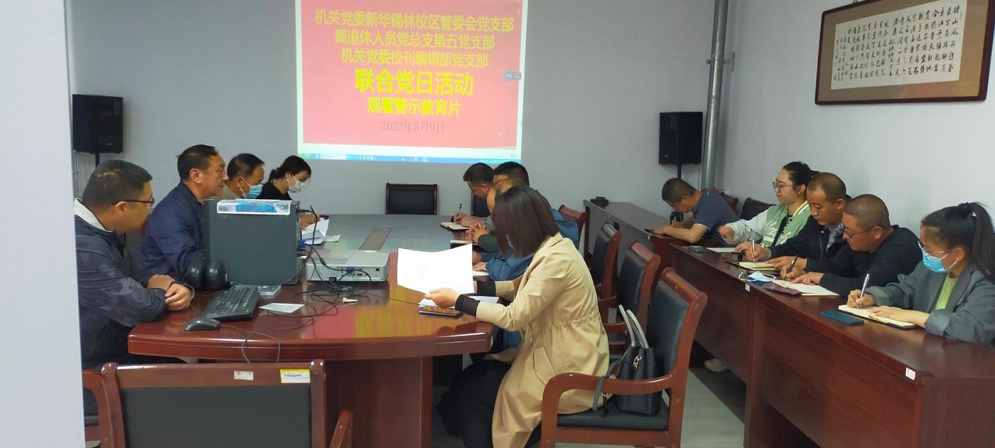 为进一步增强全体党员廉洁自律意识,充分发挥典型案例警示教育作用,根据学校机关党委的工作要求。5月9日上午,新华锡林校区管委会党支部联合机关学术期刊编辑部党支部、离退休工作人员党总支第五党支部开展了廉政警示教育主题党日活动。